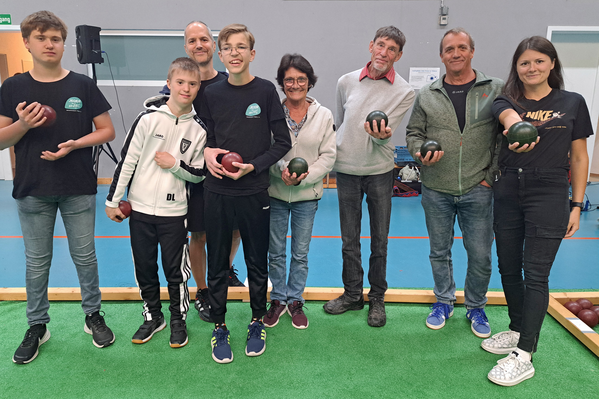 Teams: „Die flotten Vier“ und „Die Boccia-Sterne“, auf dem Foto: Die flotten Vier: Julius Hofmann, Jannis Burkardt, Timo Burkardt, Max Wetzig und Boccia-Sterne: Elke Schmidt, Wilfried Fischer, Volker Strauch, Paula Kljajic