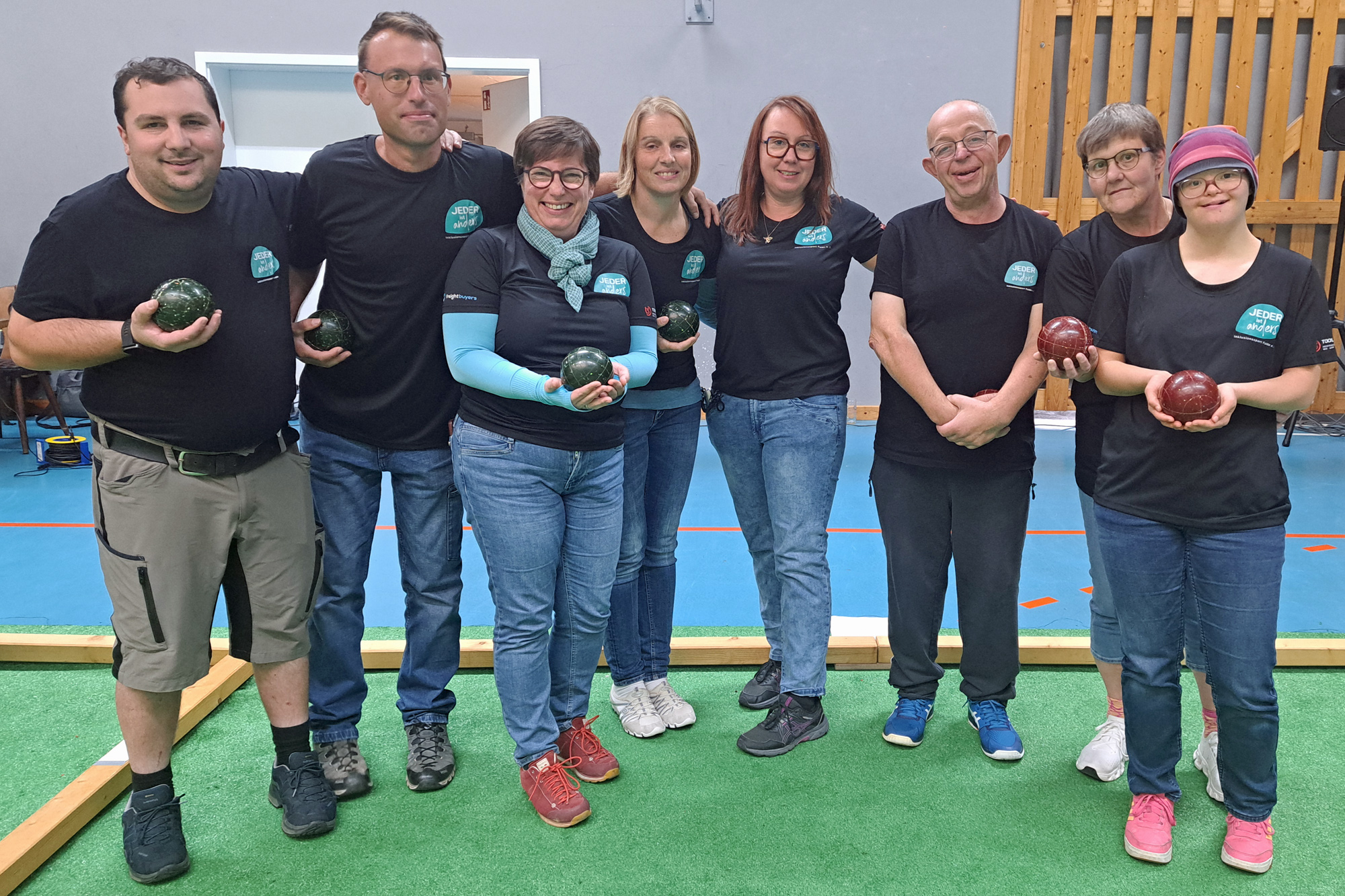 Team: „Die Boccia-Sterne“ (1. Platz), auf dem Foto: Daniel Plappert, Christian Strunz, Wilfried Fischer, Elke Schmidt, Volker Strauch, Paula Kljajic, Maryan Fetyan Faraj