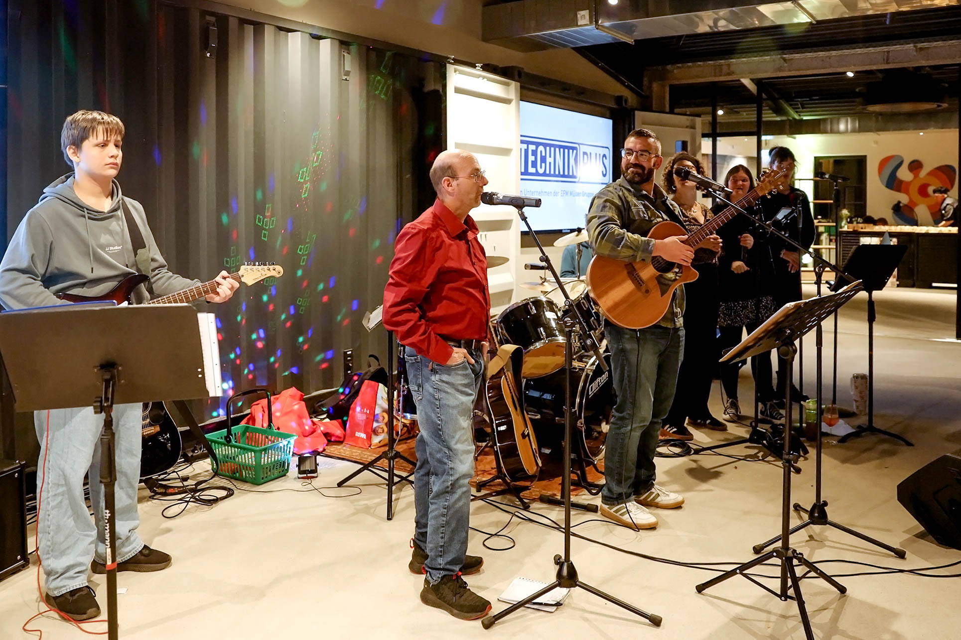 Später am Abend füllt sich der Raum mit Stimmengewirr und dem Duft von kross gebratenem Roastbeef und karamellisiertem Zucker. Die Gäste wechseln zwischen den Kochstationen, probieren, fragen nach, applaudieren. Die antonius Band sorgt währenddessen für Stimmung.