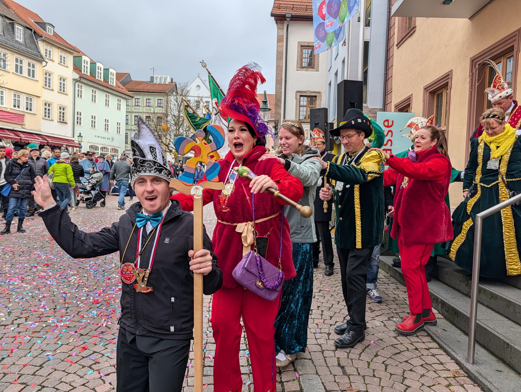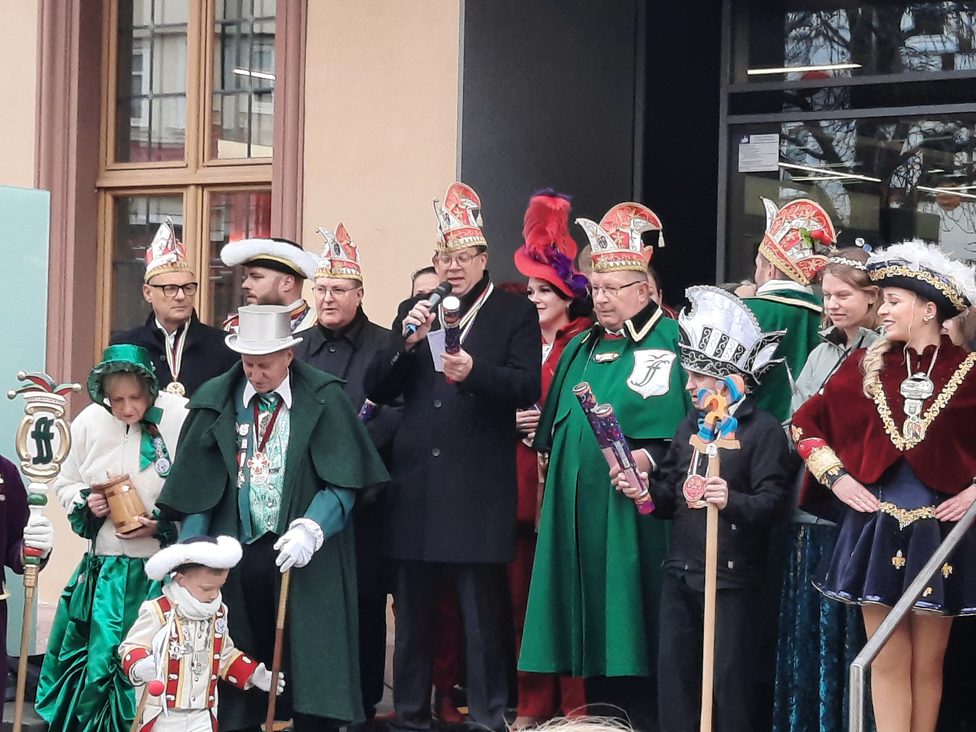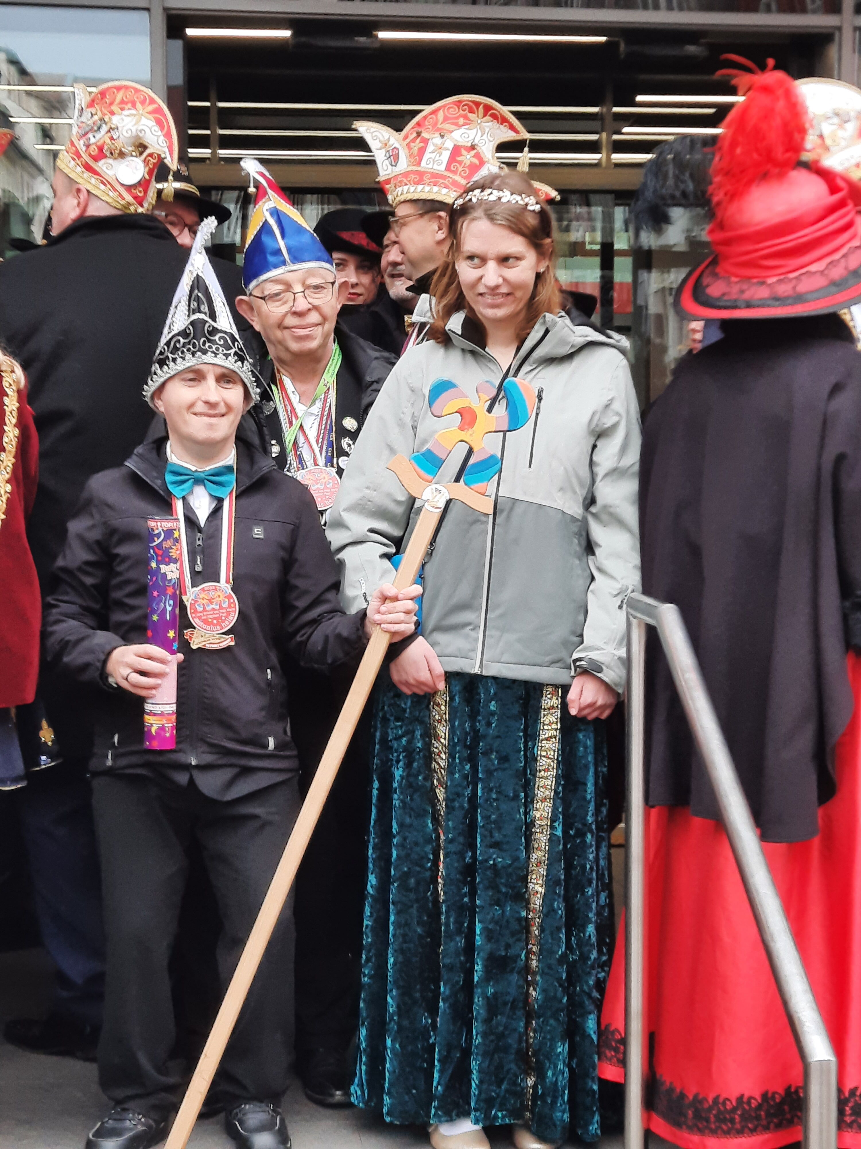 Das närrische Trio von antonius war so aufgeregt, dass es am 11.11. glatt eine Stunde zu früh am Buttermarkt eintraf, um den Start in die närrische fünfte Jahreszeit zu feiern. Aber besser zu früh als zu spät dachten sich unsern „Jong“ Kristof Bromm, „Maje“ Marie Gatzka und Adjutant Paul Trettau, die mit großer Begeisterung dem Fastnachtsstart entgegenfieberten. Dieser wurde unserem Trio sehr leicht gemacht: Überall herrschte ein großes „Hallo“ und herzliches Schulterklopfen, als die Narren aus den Randstaaten unser Dreigestirn entdeckten. Schwuppdiwupp wurden Jong, Maje und Adjutant eingereiht in den musikalischen Sternmarsch, der sich durch die Stadt zum gut gefüllten Buttermarkt auf den Weg machte. Dort angekommen wurden die drei gleich in die Runde der Tollitäten aufgenommen, die sich auf der großen Treppe vor der Sparkasse versammelt hatten. Am Ende führte unseren Jong nicht nur eine Polonäse über den Buttermarkt an, sondern er durfte auch eine der Konfettikanonen zünden, mit denen die fünfte närrische Jahreszeit eröffnet wurde. Man merkte es den dreien an: Gerne würden sie noch ein weiteres Jahr Regentschaft dranhängen, doch am Donnerstag, 13. November, wird ein neues Dreigestirn ausgelost. Was bleibt, das ist die Erinnerung an eine tolle närrische Kampagne, in der das Trio viele Menschen kennenlernen durften, mit denen sie ausgelassen und fröhlich Fasching feiern durften.
