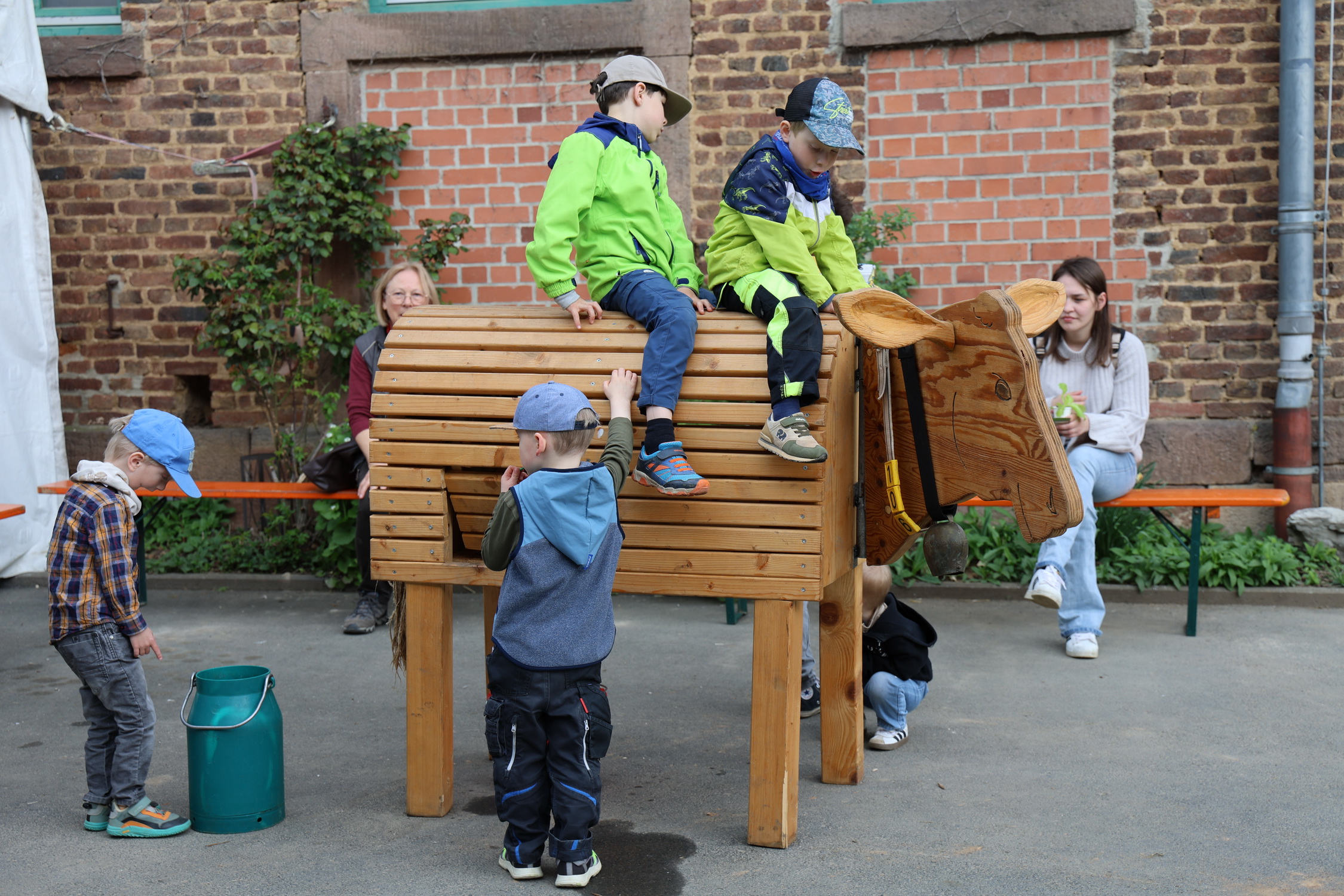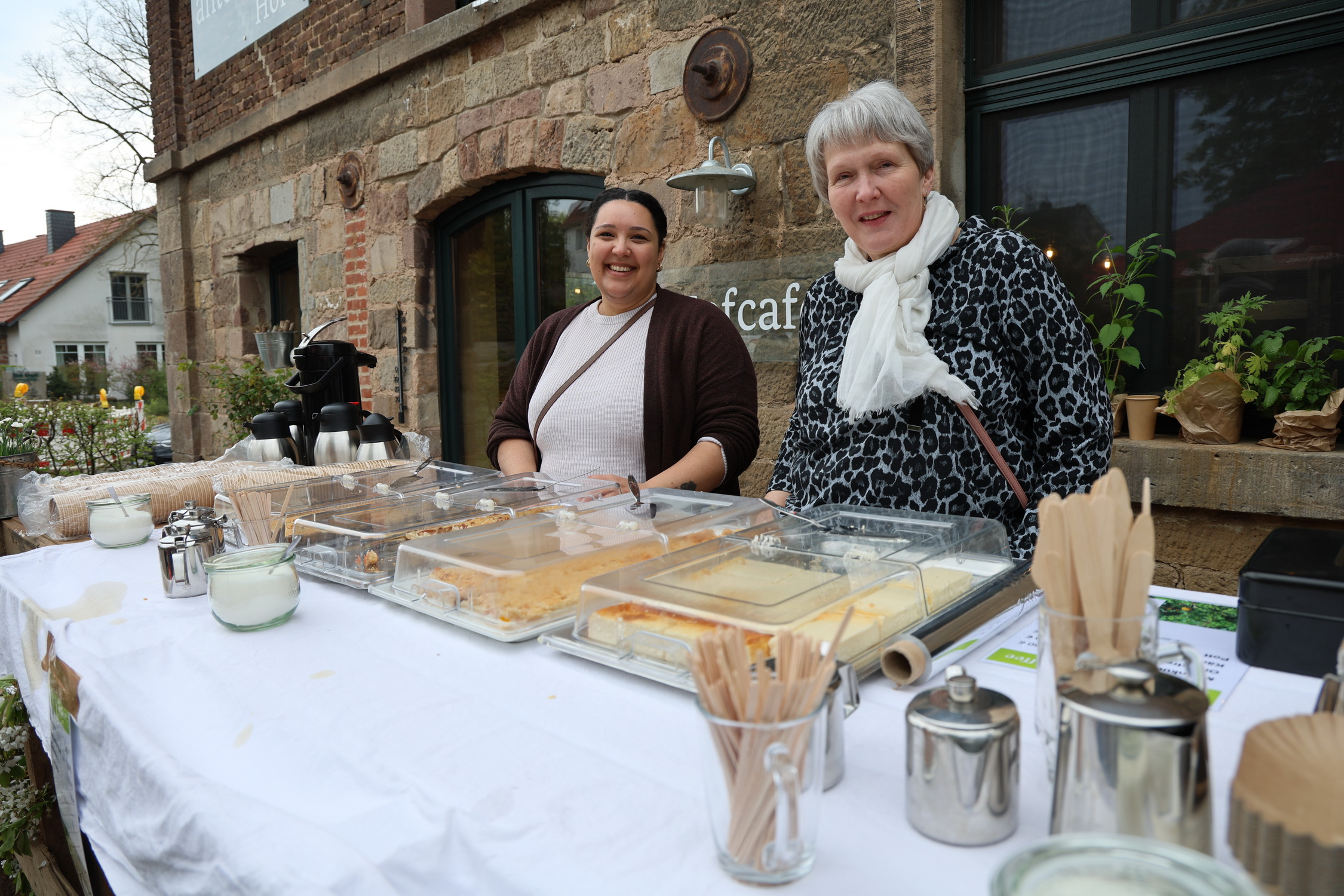 Für das leibliche Wohl sorgte das Hof-Team mit Spezialitäten vom Grill und hausgemachtem Kuchen. Bei einer Tasse Kaffee oder einem Bratwurst-Brötchen genossen viele Gäste die Sonne und die entspannte Atmosphäre auf dem Hof. Von der Außenbestuhlung des Hofcafés blieb kaum ein Platz frei.