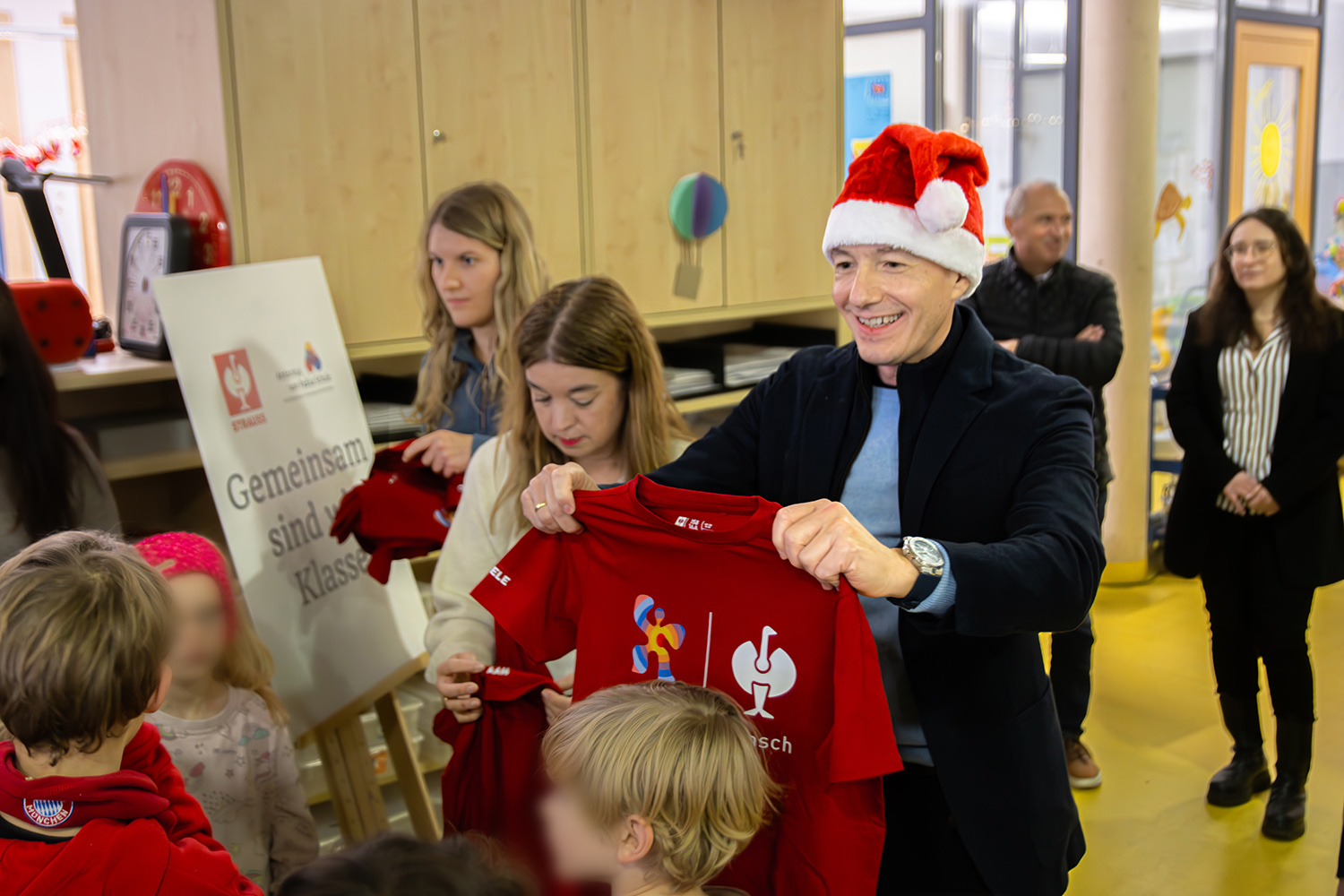 An diesem Tag ist Steffen Strauss mit Mitgliedern der Führungsgemeinschaft von antonius aber auch in die Schule gekommen, um die Kinder zu erfreuen. Ausgerüstet mit Jutesack und Nikolausmütze besuchen er und Rainer Sippel die mehr als 100 Köpfe umfassende Schülerschar in einem Gruppenraum, wo sie mit dem schönen Lied „24 Türchen hat die Weihnachtszeit“ empfangen werden. Und dann ist es Zeit, das Geheimnis der Jutesäcke zu lüften: Für jedes Kind hat Steffen Strauss ein T-Shirt mitgebracht, das die Verbindung zwischen seiner Familie und der antonius-Gemeinschaft spiegelt. Sofort drängen sich Nele, Liam, Johann und die vielen anderen Kinder um die beiden „Nikoläuse“ und lassen sich sofort die Hemden überziehen, die sie fortan stolz präsentieren. Und dann gibt es für den Gast aus dem Main-Kinzig-Kreis noch ein Geburtstagsständchen. „Wie schön, dass du geboren bist“ schallt es dem Gast entgegen, der ein paar Tage zuvor ein Jahr älter geworden ist.