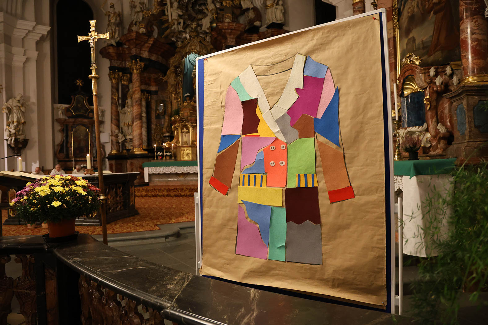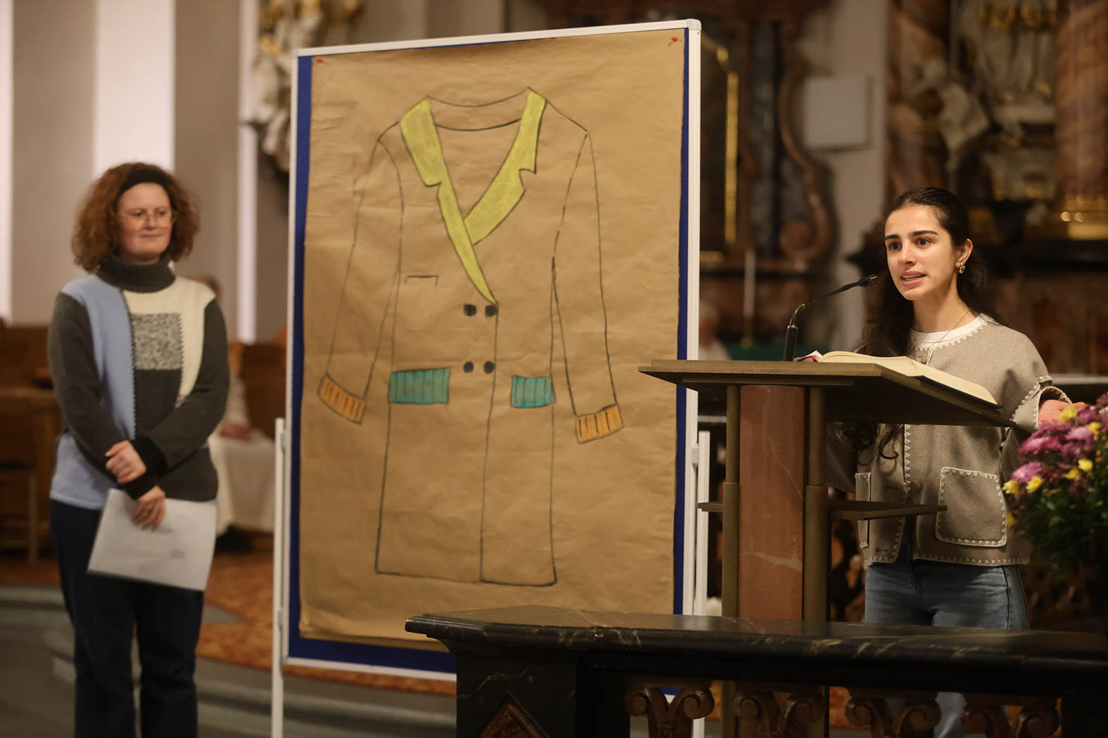 Ein Höhepunkt des Abends war die gemeinsame Aktion rund um den Mantel. Auf einer großen Fläche war die Silhouette eines Mantels zu sehen, noch leer und unscheinbar. Während ein Text vorgelesen wurde, brachten Jugendliche und Erwachsene kleine Stoffstücke an diesem Mantel an. Schritt für Schritt entstand ein Gemeinschaftswerk. Die Botschaft war einfach. Wenn Menschen etwas beisteuern, entsteht etwas Größeres und niemand verliert dabei etwas. Am Ende war der Mantel komplett gefüllt. Die vielen Stoffstücke ergaben ein buntes Bild, das für die Vielfalt der Menschen stand, die ihn gestaltet hatten.
