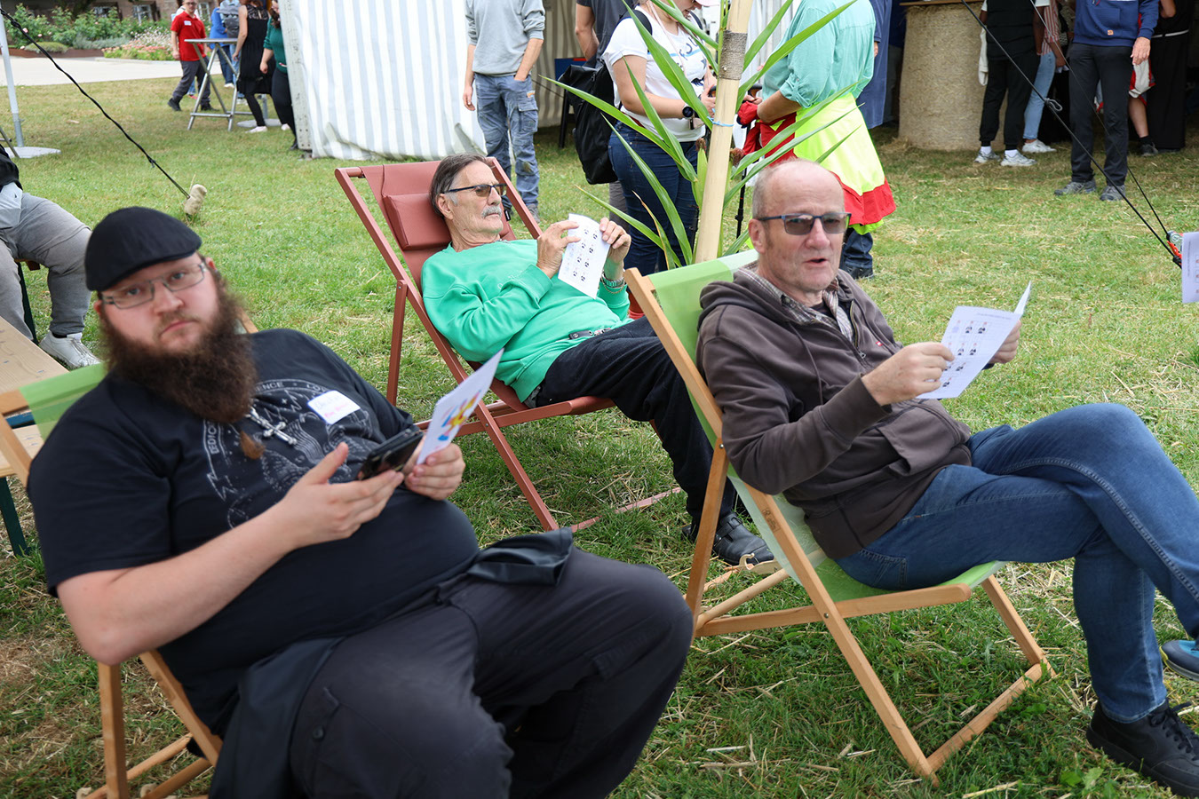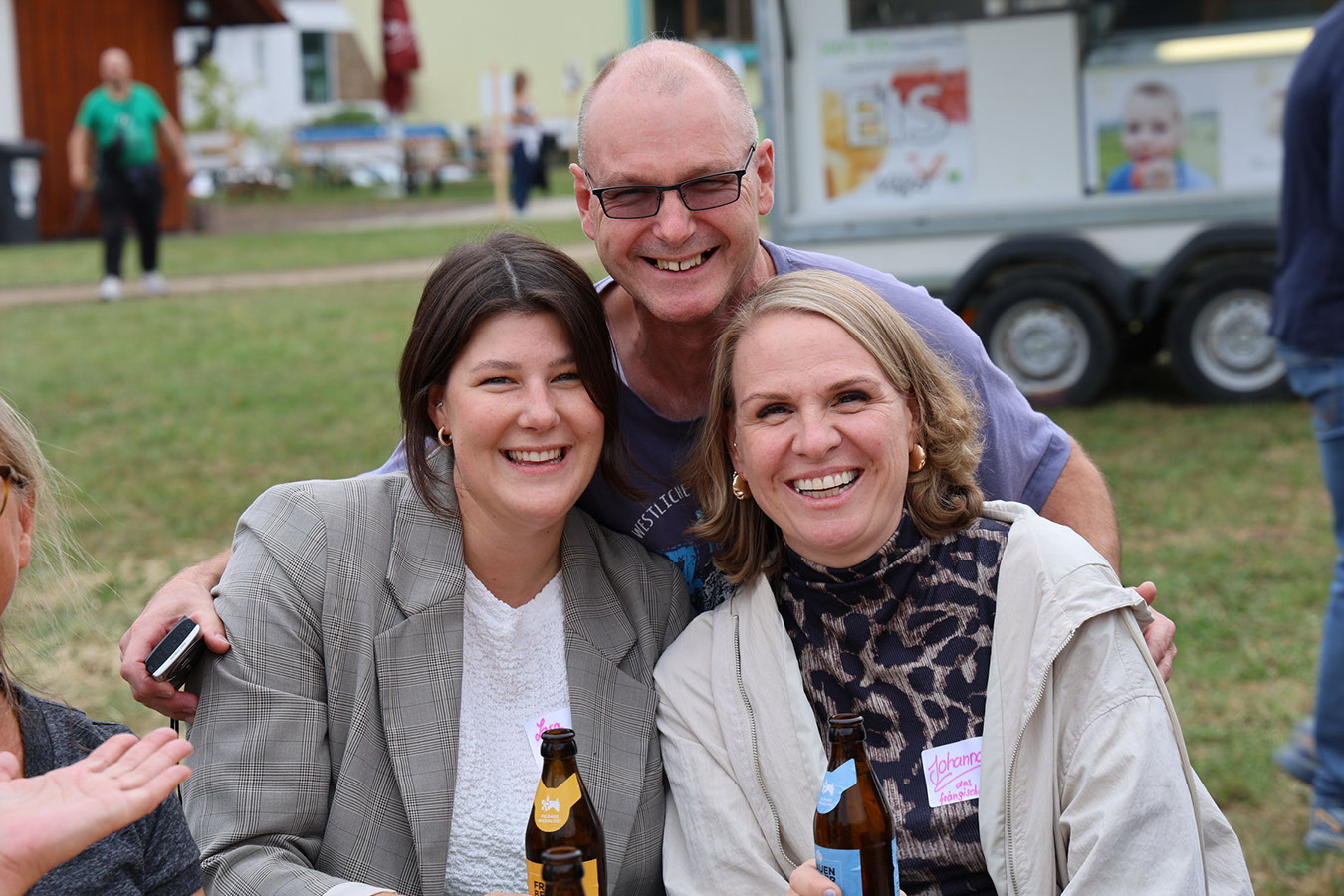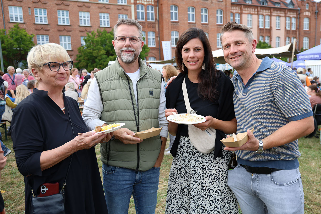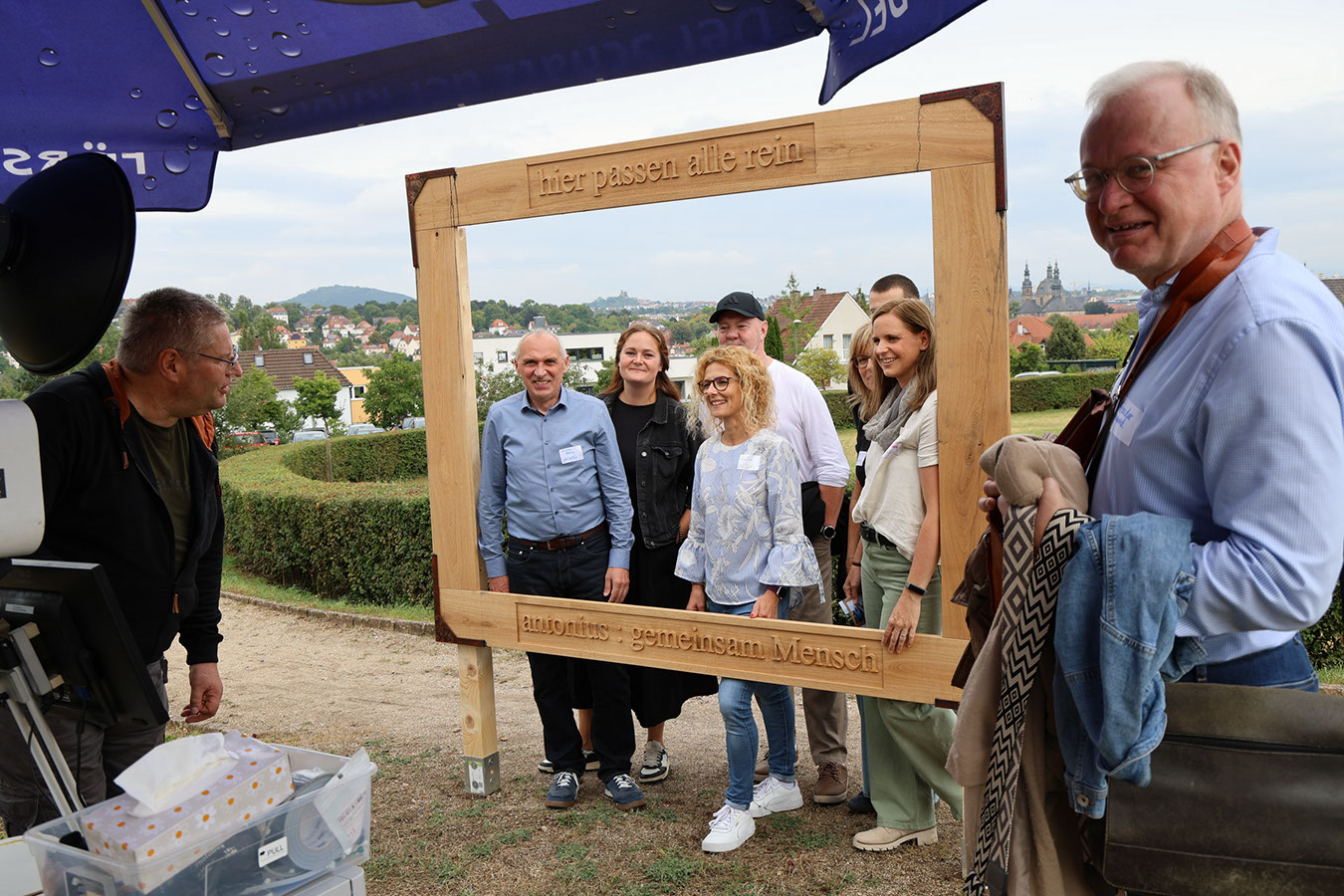 Danach zog es die Gäste zu den Ständen mit den unterschiedlichsten Köstlichkeiten. Die kulinarische Vielfalt, die Partner von antonius vorbereitet hatten, reichte vom Schwartenmagenburger über Fischgerichte bis zur indischen Reispfanne oder Gyros. Besonders begehrt war das Eis zum Nachtisch – mit einer Schlange, die fast kein Ende nehmen wollte. Doch schließlich kamen alle auf ihre Kosten. Großen Anklang fand erneut die Fotobox, die diesmal am neuen Fotopoint auf der Festwiese aufgebaut war. Dort steht seit dieser Woche ein eindrucksvoller Bilderrahmen aus massiver Eiche und der Botschaft „Hier passen alle rein“, gefertigt von den Kollegen der Schreinerei. Ein herzliches Dankeschön an Marek Saalfeld und sein Team für diese gelungene Arbeit!