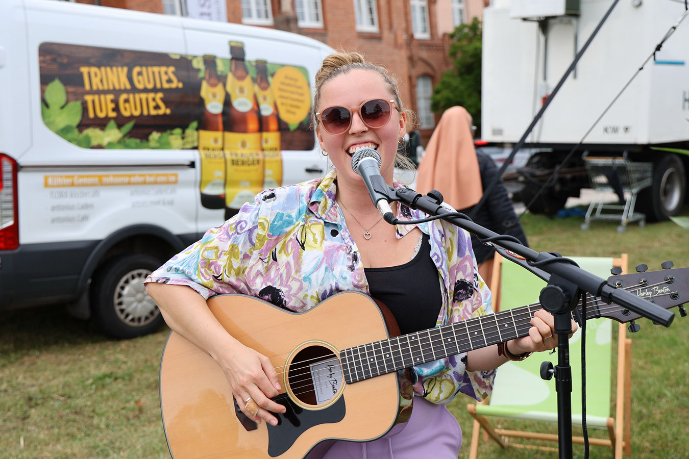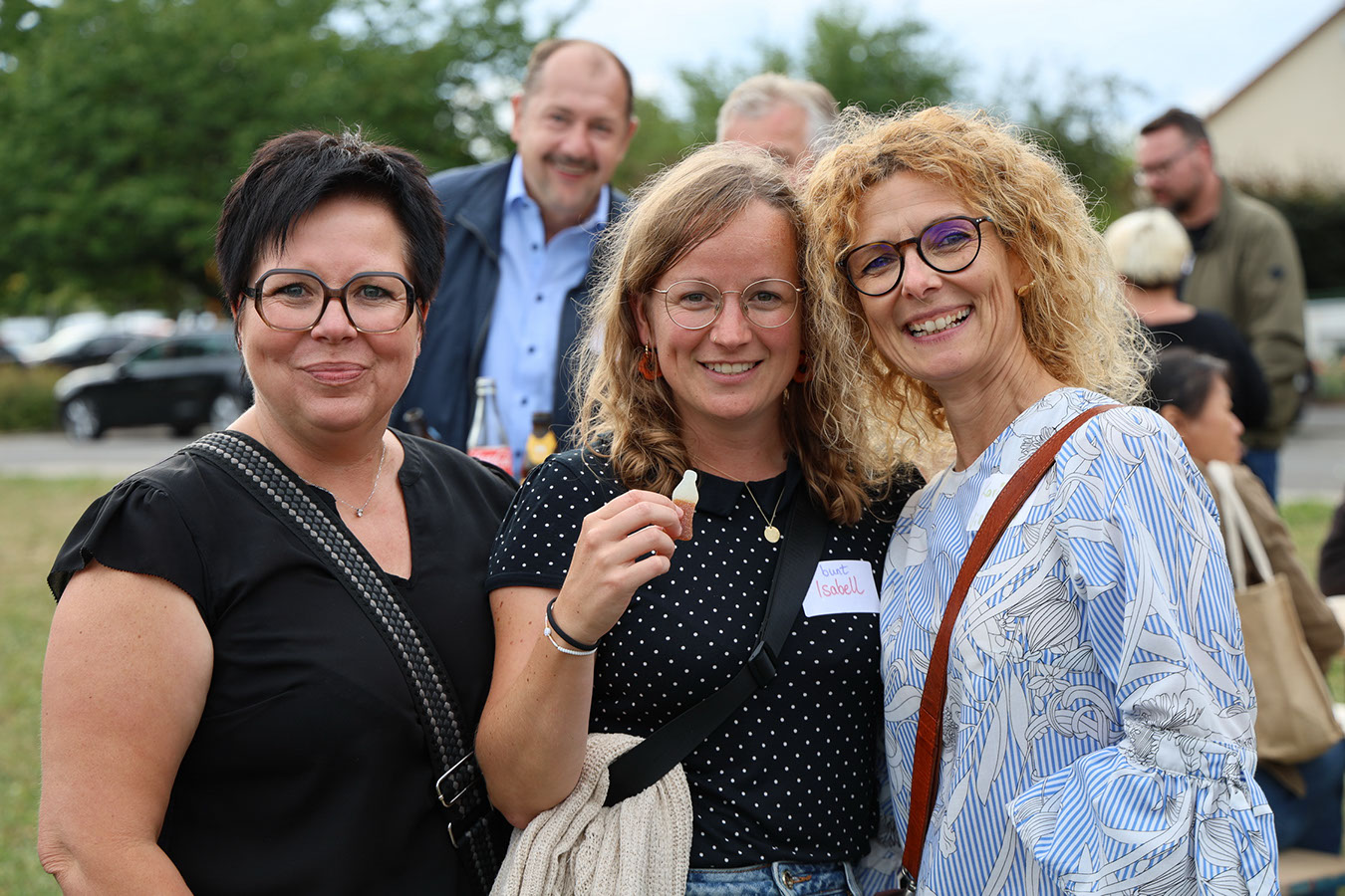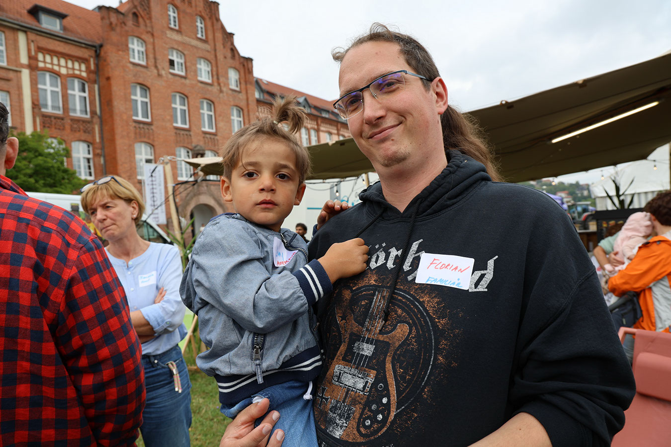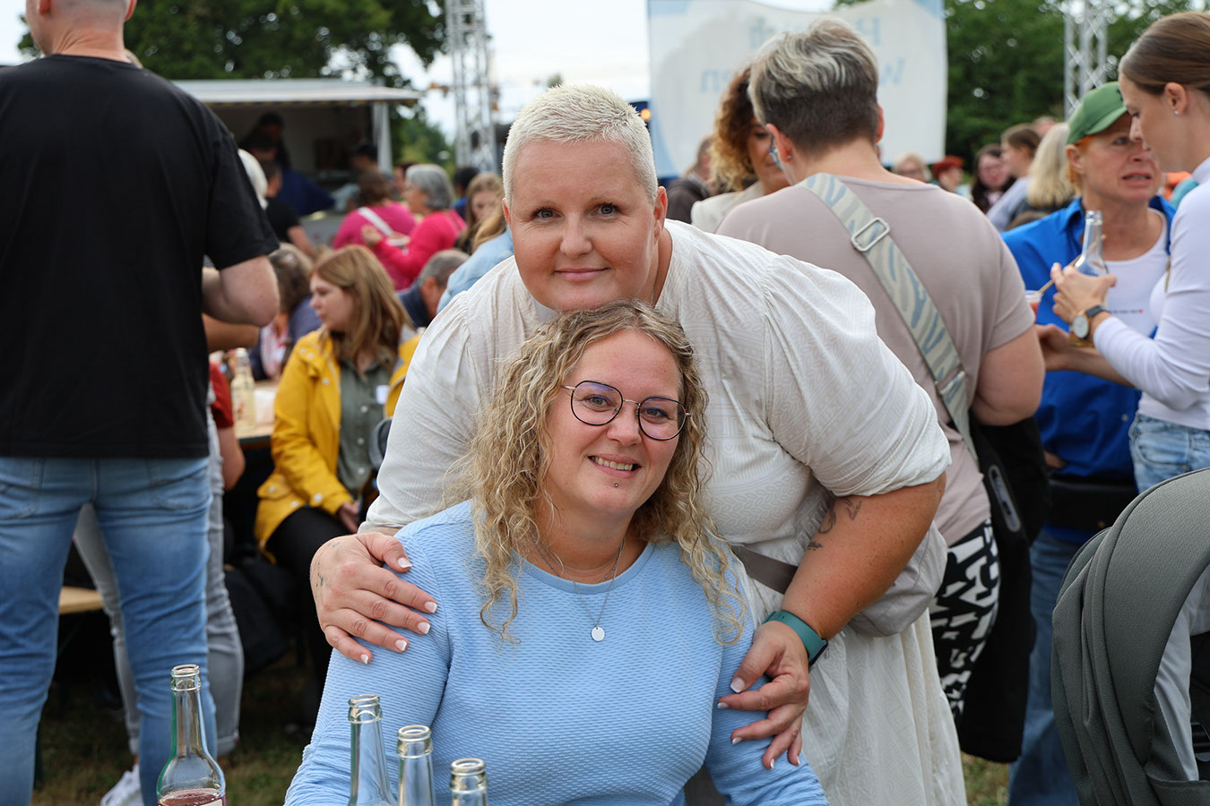 Danach zog es die Gäste zu den Ständen mit den unterschiedlichsten Köstlichkeiten. Die kulinarische Vielfalt, die Partner von antonius vorbereitet hatten, reichte vom Schwartenmagenburger über Fischgerichte bis zur indischen Reispfanne oder Gyros. Besonders begehrt war das Eis zum Nachtisch – mit einer Schlange, die fast kein Ende nehmen wollte. Doch schließlich kamen alle auf ihre Kosten. Großen Anklang fand erneut die Fotobox, die diesmal am neuen Fotopoint auf der Festwiese aufgebaut war. Dort steht seit dieser Woche ein eindrucksvoller Bilderrahmen aus massiver Eiche und der Botschaft „Hier passen alle rein“, gefertigt von den Kollegen der Schreinerei. Ein herzliches Dankeschön an Marek Saalfeld und sein Team für diese gelungene Arbeit!