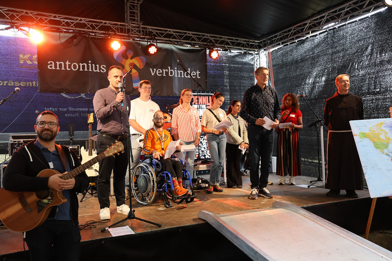 Im vollbesetzten Festzelt eröffneten Pater Thomas und sein Team die Feier mit einer Andacht. Darin feierten sie alle Anwesenden als „mutige Propheten der Vielfalt“, die Spaltung in „Die“ und „Wir“ überwinden. Bereits zuvor hatte Vorstandsmitglied Steffen Heller seine Freude darüber ausgedrückt, „in so viele entspannte und fröhliche Gesichter“ blicken zu dürfen. Gerade angesichts der vielen Veränderungen, die die Arbeit manchmal erschweren, sei es der Zusammenhalt, der zähle – und genau darin liege die besondere Stärke von antonius. Vorstandskollege Rainer Sippel dankte insbesondere allen Ehren- und Hauptamtlichen ausdrücklich für ihre zuverlässige und loyale Mitarbeit.