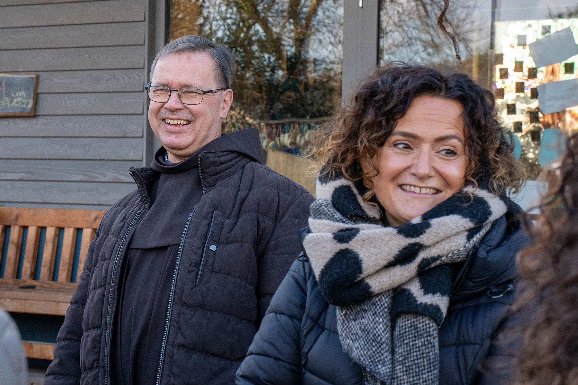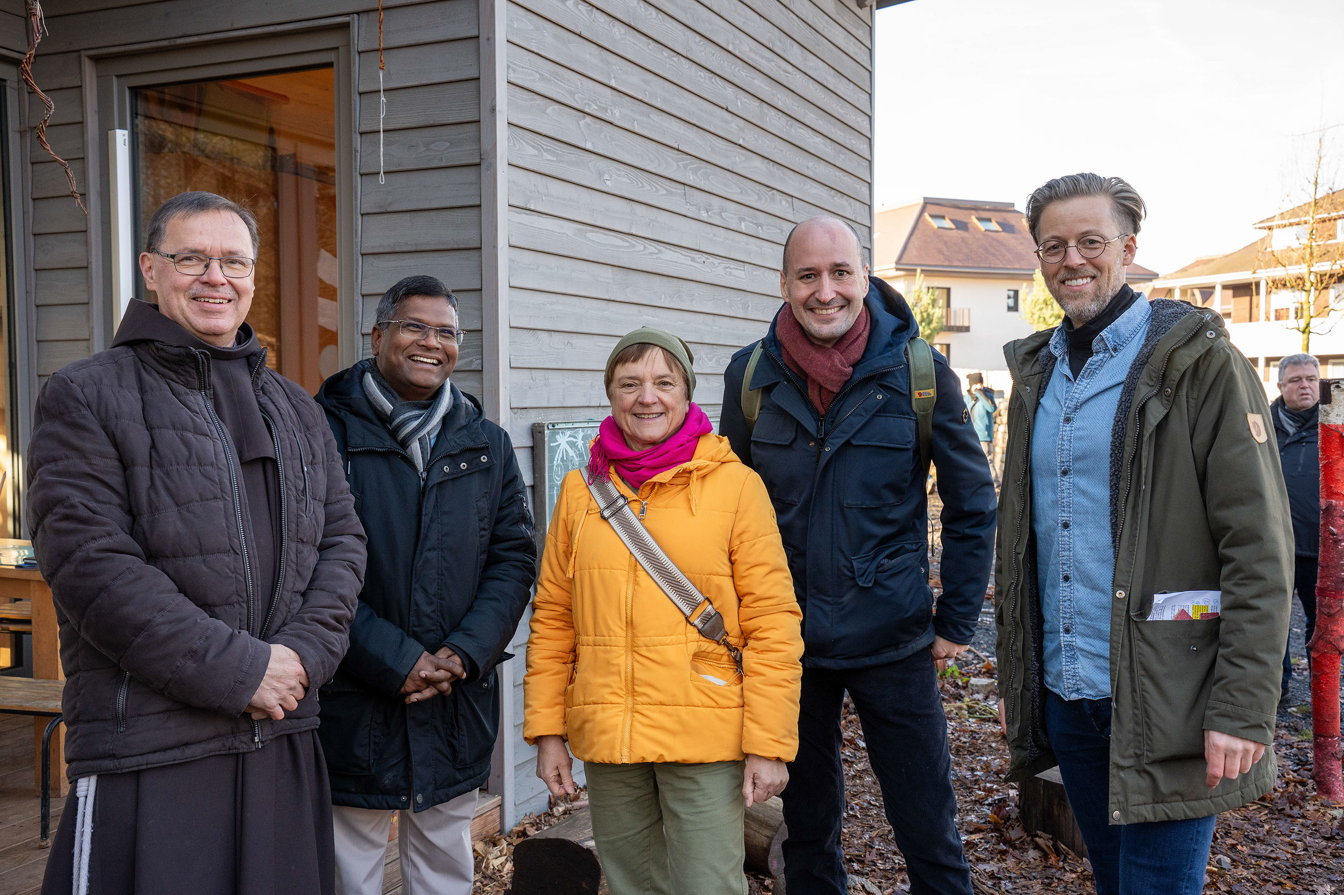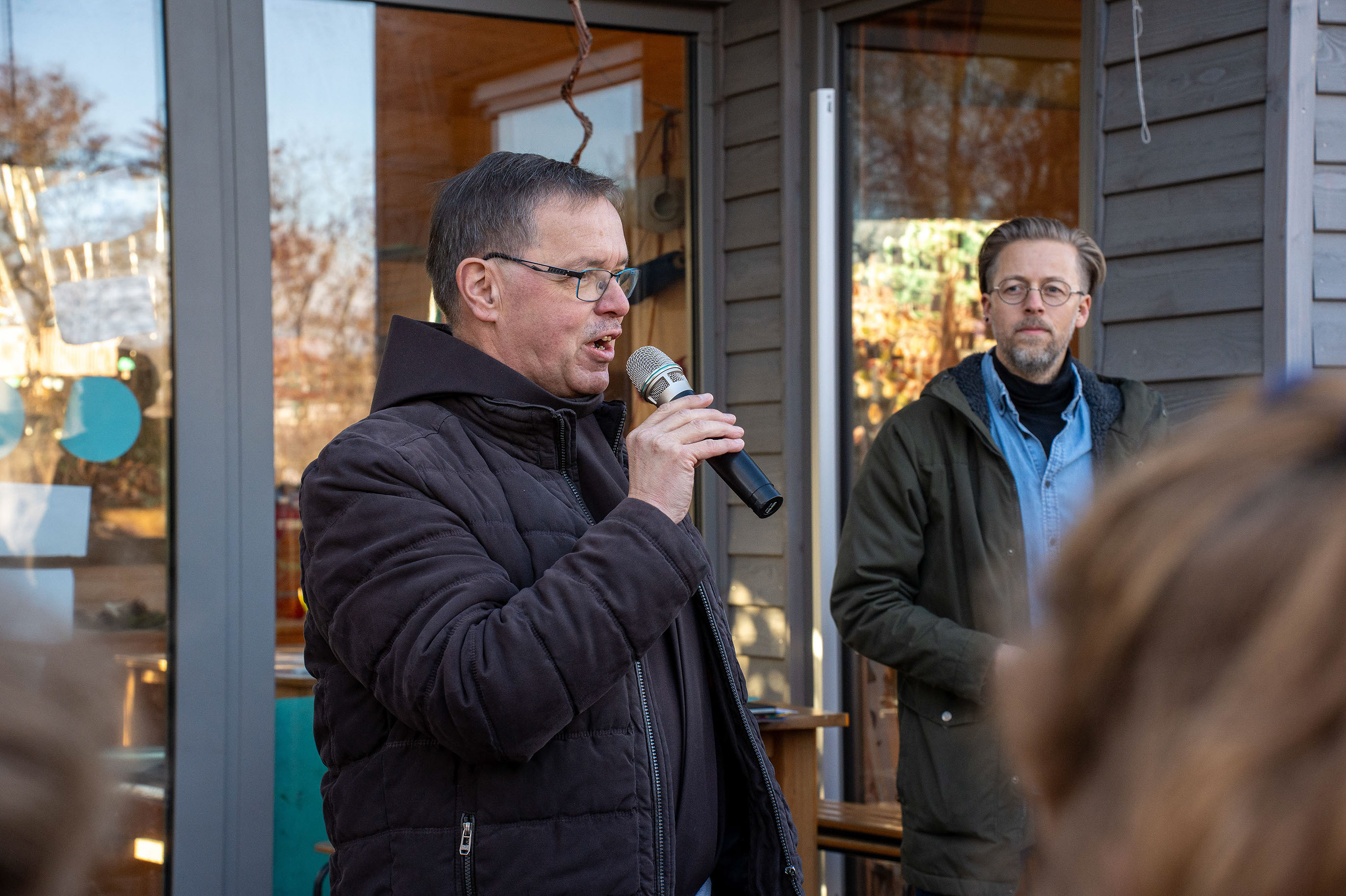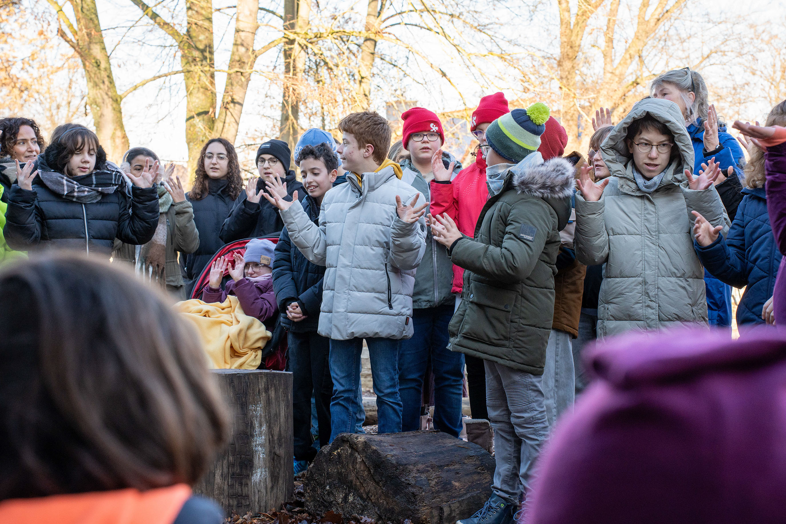 Das erste Türchen öffnete die Gruppe „Gartenkinder“ der Kita ambinius. Bei ihrer Schutzhütte fand in großer Runde am Montag, 1. Dezember 2025, die feierliche Eröffnung des Adventskalenders statt. Mit dabei waren neben den Gartenkindern auch viele Schülerinnen und Schüler der Antonius von Padua-Schule sowie Pater Raj von der Pfarrgemeinde St. Martin und Jonathan Wulf, Leiter des Hessischen Amts für Versorgung und Soziales aus der nahen Washingtonallee. Dieser sagte: „Das Quartier hier kann nur zusammenwachsen, wenn man auch weiß, was und wen es drumherum gibt. Daher freuen wir uns sehr, bei diesem Adventskalender dabeizusein und selbst auch mehr über unsere Nachbarschaft zu erfahren.“