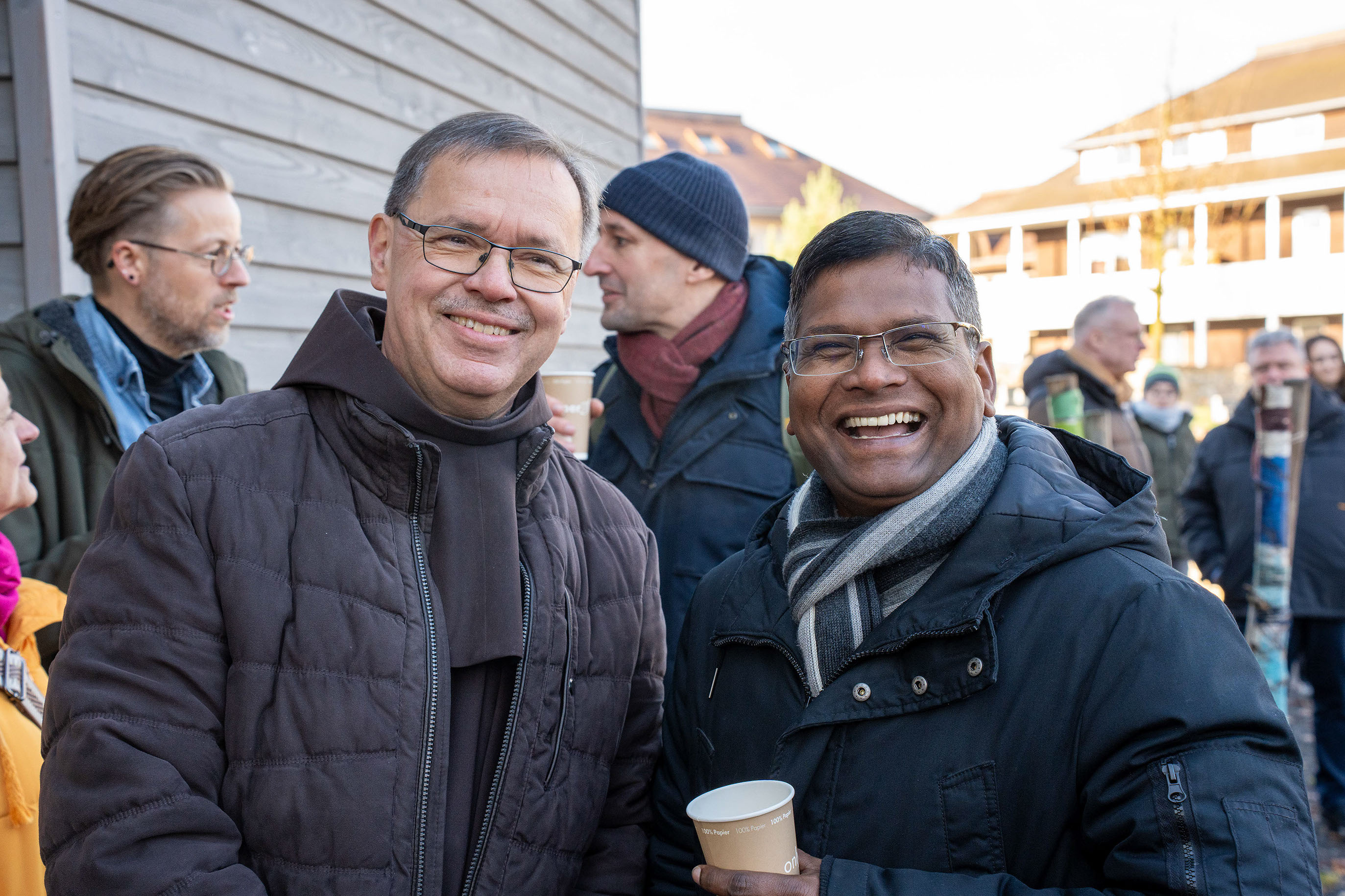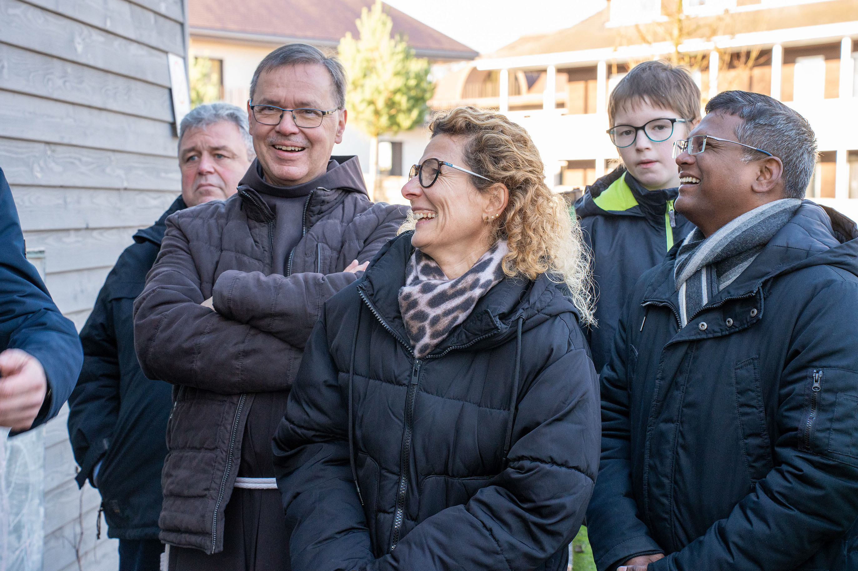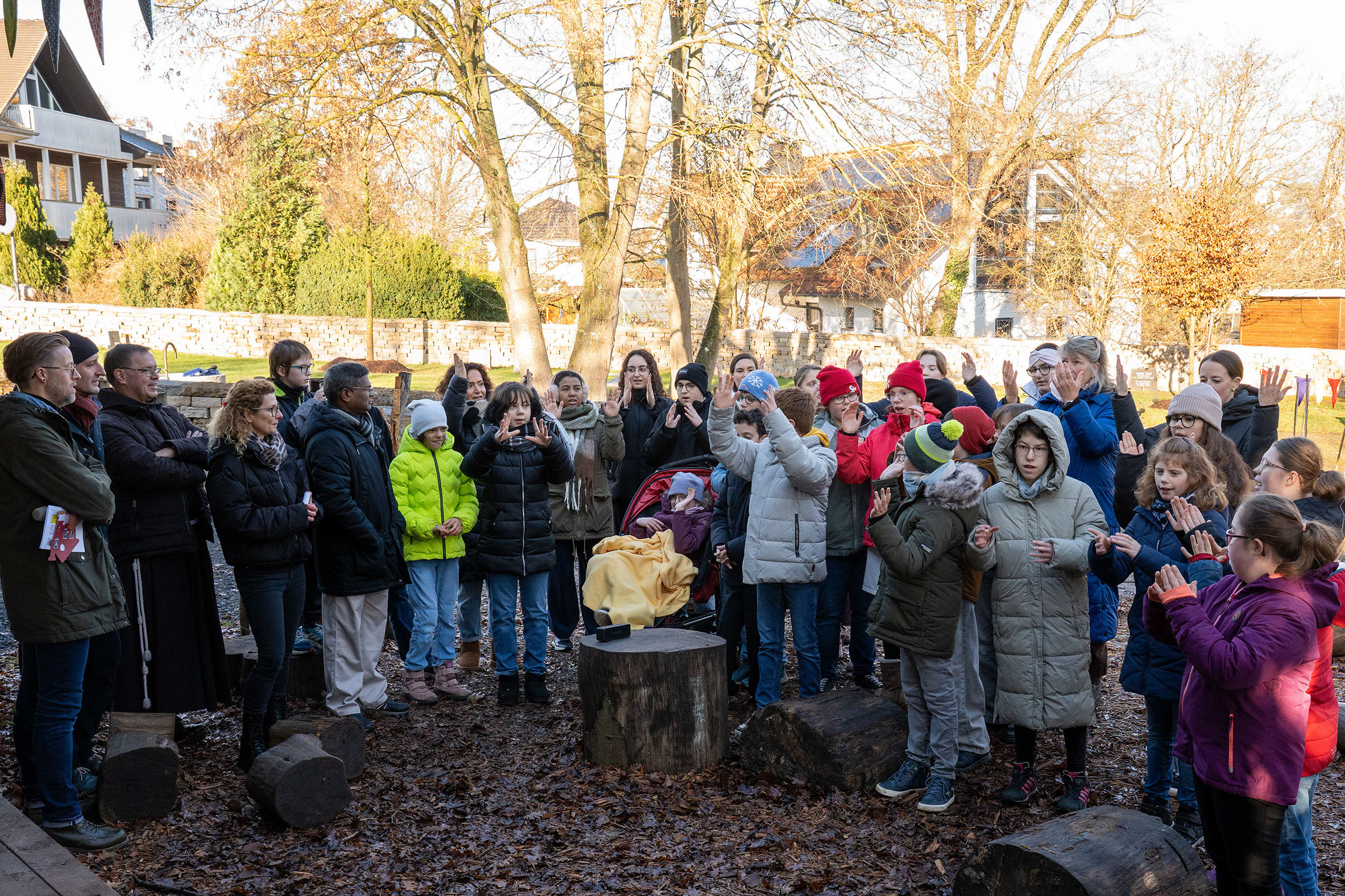 Sebastian Bönisch vom antonius Führungsteam erklärte, wie es zur Idee für den „besonderen Adventskalender“ kam: „antonius möchte sein Quartier stärker öffnen. Wir wollen Räume der Begegnung schaffen und noch mehr zeigen, dass wir eine vielfältige Gemeinschaft sind. Und womit fängt das an? Mit offenen Türen! Mit dem Türen-Öffnen wollen wir einladen, miteinander ins Gespräch zu kommen und ein aktives Miteinander zu gestalten.“ antonius-Seelsorger Pater Thomas ergänzte: „Die Tür gehört zum Advent. Denn jetzt vor Weihnachten öffnen wir unsere Türen für den Heiland – Jesus – und zugleich auch für unsere Nächsten. Jeder zeigt dabei etwas von sich selbst, was dabei hilft, sich besser kennenzulernen. So soll Segen liegen auf den 24 Tagen, die vor uns liegen – mit ganz viel Freude und vielen schönen Begegnungen.“ Die Gartenkinder bereicherten die Eröffnung mit einem kleinen Theaterstück und die Mittelstufe der Antonius von Padua-Schule mit dem Adventslied „Singen wir im Schein der Kerzen“.